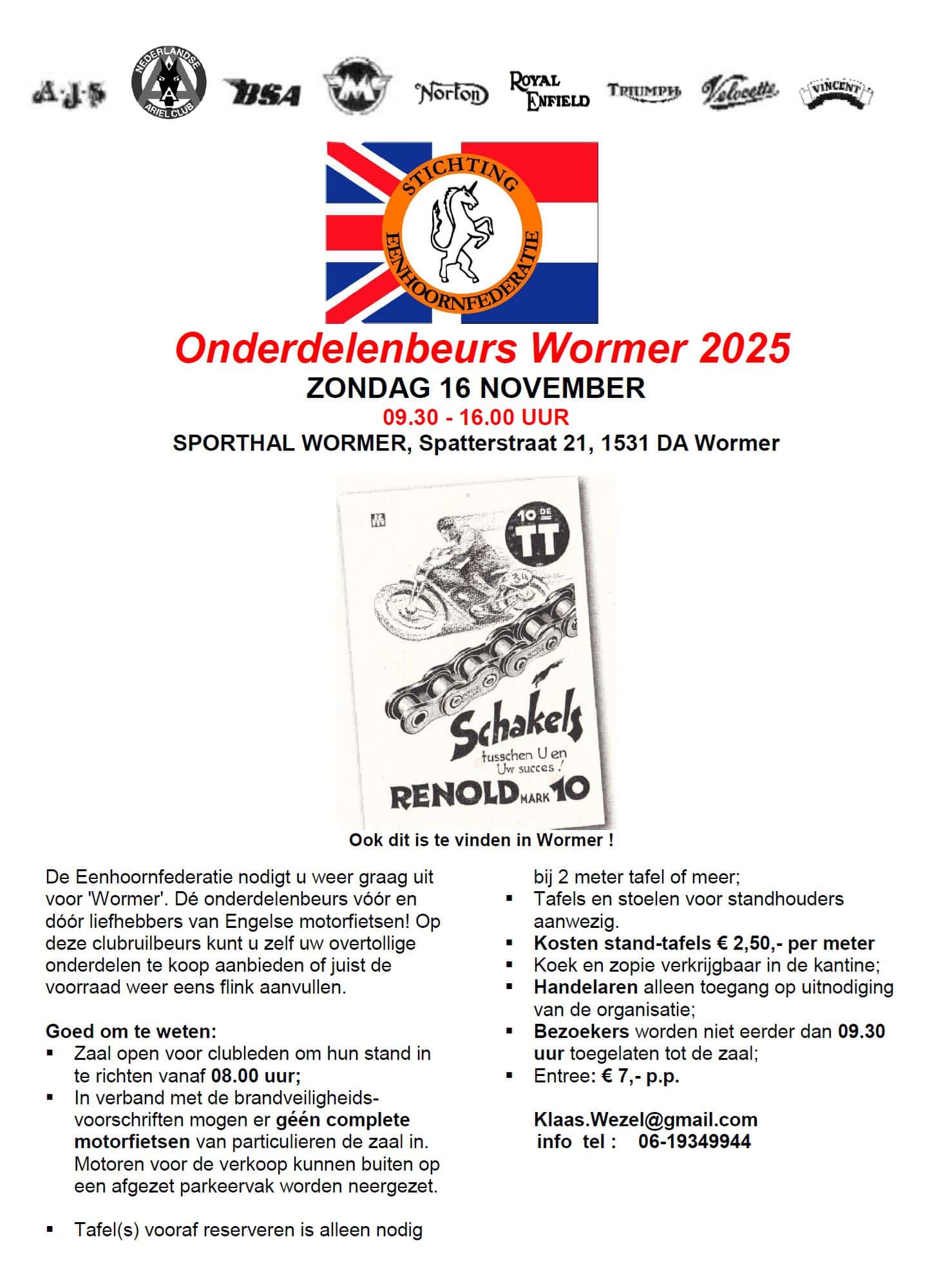 « Alle Evenementen Eenhoorn Onderdelenbeurs Wormer 2025 16 november @ 09:30 - 16:00 € 7,00 « Bestuursvergadering Eenhoorn 2025-2 Online Bestuursvergadering Eenhoorn 2026-1 » Toevoegen aan kalender Google Calendar iCalendar Outlook 365 Outlook Live Gegevens Datum: 16 november Tijd: 09:30 - 16:00 Kosten: € 7,00 Evenement Categorie: beurs Evenement Tags:Eenhoorn evenement Locatie Sporthal Wormer Spatterstraat 21 Wormer, 1531 DA Nederland + Google Maps Organisator BSA Owners Club Nederland Bekijk de site van Organisator